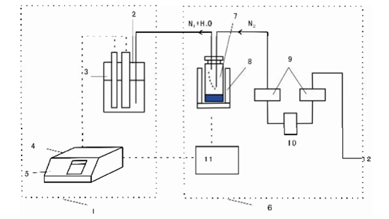 | 1——卡爾?費(fèi)休庫(kù)侖法水分儀; | 6——卡式加熱爐; | 10——?dú)怏w流量計(jì); |